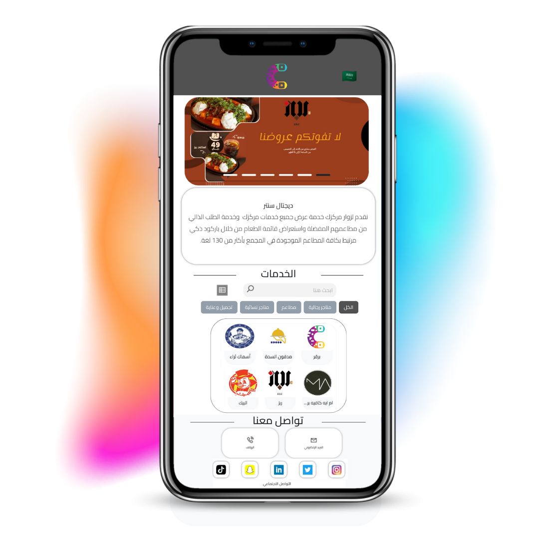 In Digital Center, we offer a self-ordering service from restaurants located inside your mall without the customer downloading any application only by scanning the customer of a smart barcode linked to all the restaurants in the complex, through which the customer can choose the desired restaurant and review the translated restaurant menu for more from 130 languages and order electronically from anywhere in the complex.